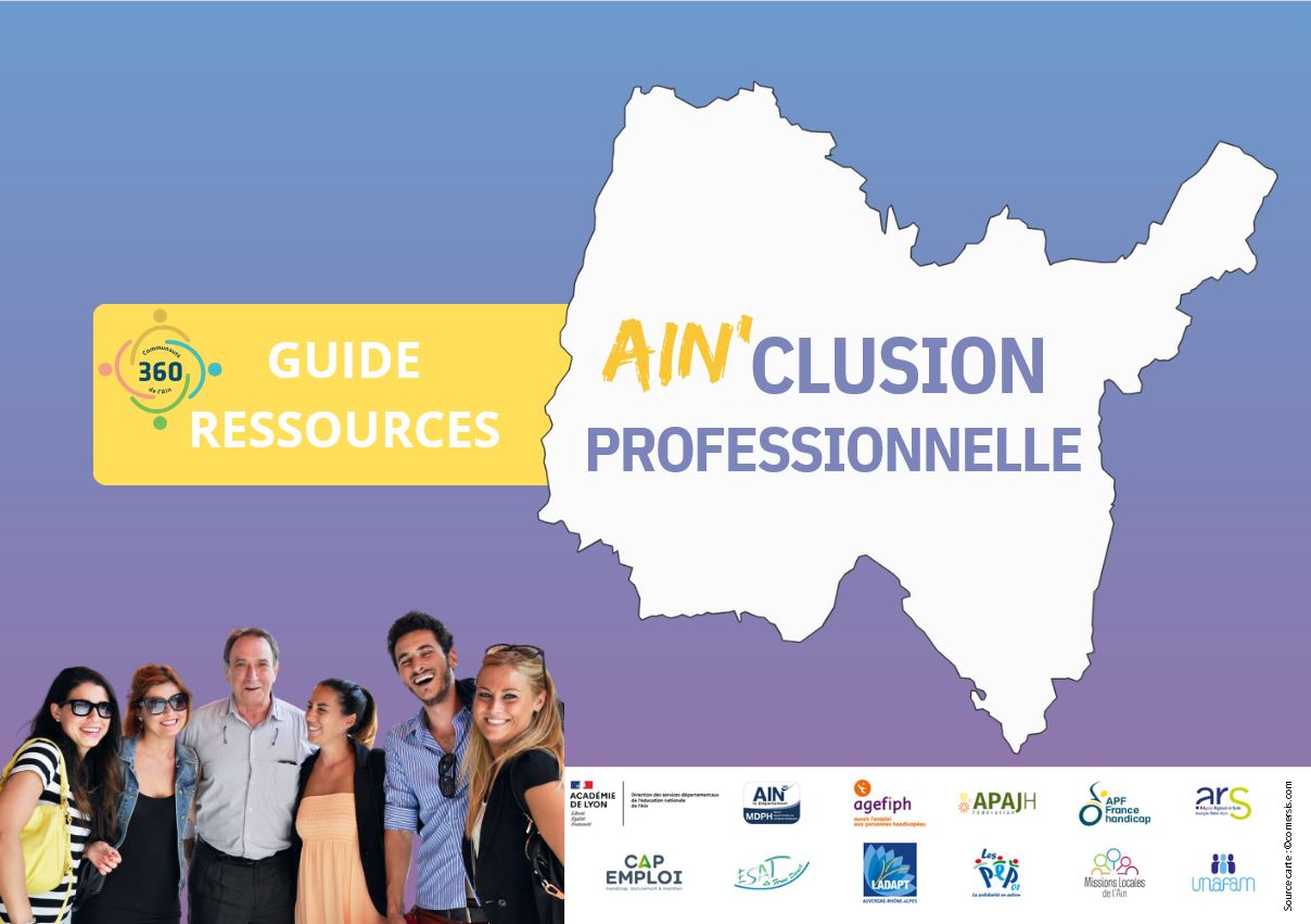 Ce guide ressources a été élaboré par les membres de la commission Ain’clusion Professionnelle de la Communauté 360. Il a pour objectif d’être un outil pratique recensant les aides et dispositifs mobilisables tout au long du parcours professionnel des jeunes adultes et adultes en situation de handicap. Ce document, non exhaustif, s’adresse aux personnes concernées et aux acteurs de l’accompagnement. Il concerne le territoire de l’Ain.